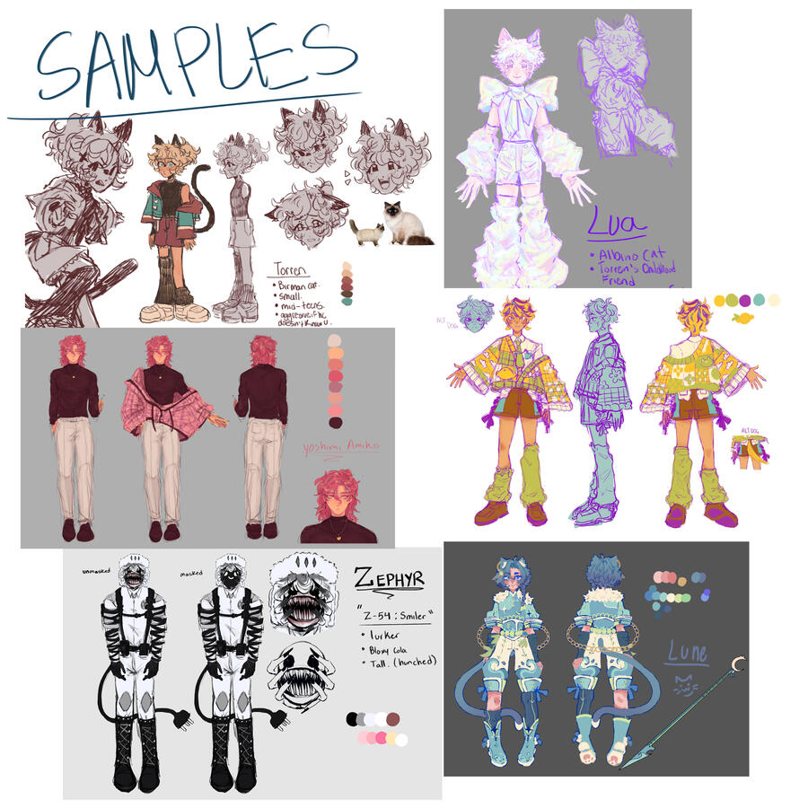 Sheets are limited to 1 character and 3 bodies, expressions are limited to the form of headshots, additional character tidbits and details are upon request!